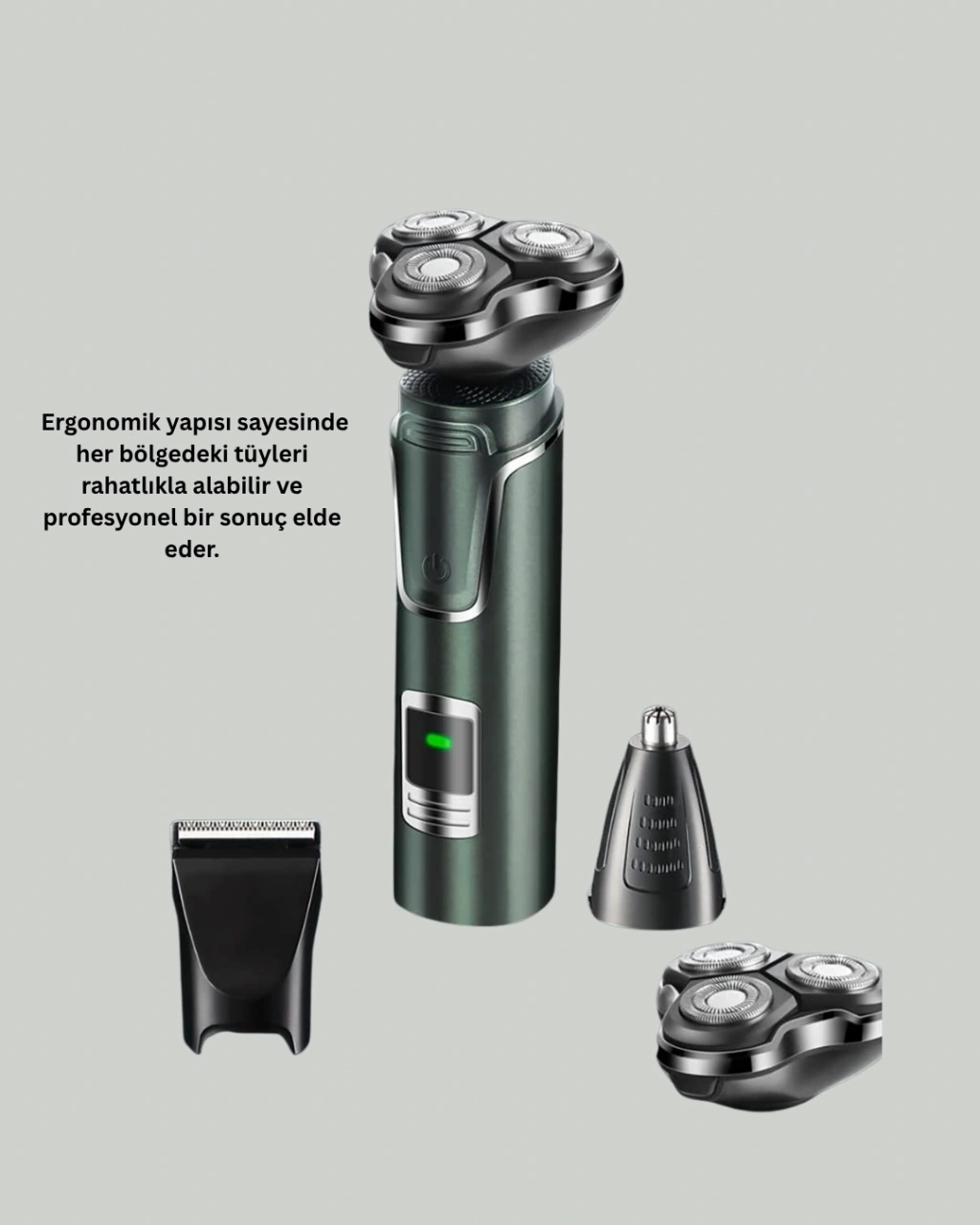 Her gün tıraş olmak artık zahmet değil; bu kompakt, çok fonksiyonlu tıraş makinesiyle keyifli bir rutine dönüşüyor. Cihaz, saç ve sakal bakımının yanı sıra burun ve kulak tüylerini almak için özel geliştirilmiş başlıklar içerir. Bu sayede yalnızca bir makineyle eksiksiz bakım mümkündür.Burun ve kulak temizleme aparatı, cilde zarar vermeden hassas bölgelerde güvenle kullanılabilir. Özel başlık yapısı sayesinde bu bölgelerdeki tüyleri etkili ve konforlu biçimde alır.Kablosuz yapısı, kullanım esnasında maksimum hareket özgürlüğü sunar. Özellikle seyahatlerde veya dış mekanlarda kullanım kolaylığı sağlar. Kuru tıraş özelliği sayesinde su ve köpük kullanmadan tıraş olabilirsiniz. Bu da pratikliğin yanı sıra zaman tasarrufu sağlar.Motor gücü ve bıçak yapısı, hızlı ve kesintisiz performans sunar. Başlıkları suyla temizlenebilir olduğundan hijyenik bir kullanım mümkündür. Ayrıca, ithalatçı garantili oluşu ürünün güvenli kullanımını destekler.Bu makine, kişisel bakımına önem veren, her an bakımlı görünmek isteyen erkeklerin çantasında mutlaka yer alması gereken akıllı bir cihazdır.