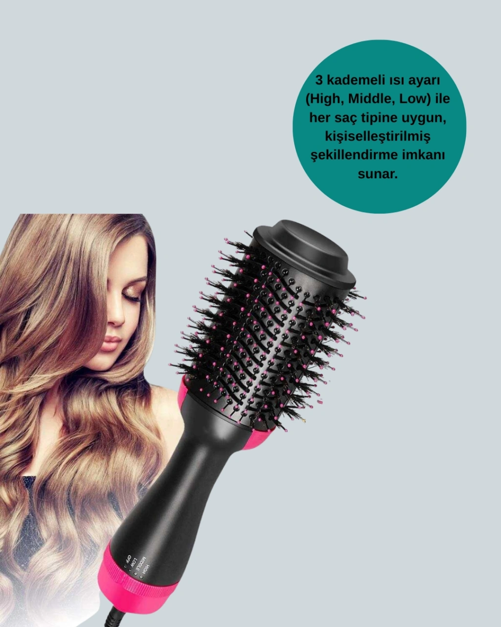 1200W Kurutmalı Saç Şekillendirici Fönlü Fırça, günlük bakımda karşılaşılan elektriklenme sorununu ortadan kaldırır. Negatif iyon teknolojisi ile saçlarınız daha pürüzsüz, parlak ve yumuşak olur. Oval fırça yapısı, saçınıza doğal hacim kazandırırken şekli uzun süre korur.Üç ısı kademesi, saç tipinize uygun bakım sağlar. Soğuk hava modu ise şeklin kalıcılığını artırır. 360° dönebilen kablosu, kullanım sırasında tam hareket özgürlüğü sunar. Hafif yapısı, uzun süreli kullanımlarda bile konfor sağlar.Ürün Özellikleri: 1200W güç Negatif iyon teknolojisi 3 ısı modu + soğuk hava Oval fırça tasarımıSaçınızı kuruturken aynı anda şekillendirmek için mükemmel bir tercihtir.