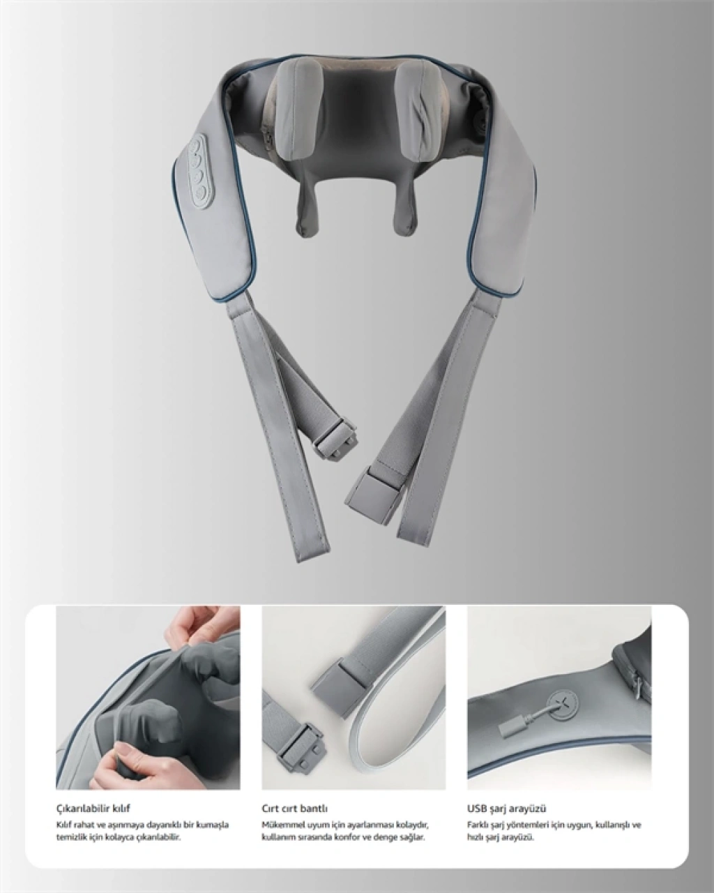 Modern yaşamın temposu omuzlarımıza yük bindiriyor. VNB-01, bu yükü hafifletmek için geliştirilmiş, profesyonel etkili bir masaj cihazıdır.Boyun, sırt, bel ve bacaklarda kullanılabilen U şeklindeki tasarımı, vücudu tamamen sararak etkili sonuçlar sunar.Yoğurma ve titreşim kombinasyonu, cihazın hem yüzeysel hem derin kas gruplarına ulaşmasını sağlar. Isı terapisi, bu etkileri pekiştirir.Farklı mod ve hız ayarları, cihazın kişisel kullanım ihtiyaçlarına göre uyarlanmasını sağlar.Kolay taşınabilirliği, her ortamda kullanım kolaylığı sunar. Masaj yaparken ellerinizi kullanmanıza gerek kalmaz; askılı tasarımı sayesinde cihaz sabit durur.Yüksek kaliteli ABS dış gövde, uzun ömürlü kullanım sunarken şık gri rengi estetik bir görünüm sağlar.USB ile şarj edilen 1800 mAh batarya, uzun süreli çalışma performansı sunar. Kontrol paneli üzerinden tüm işlevler tek tuşla yönetilebilir.